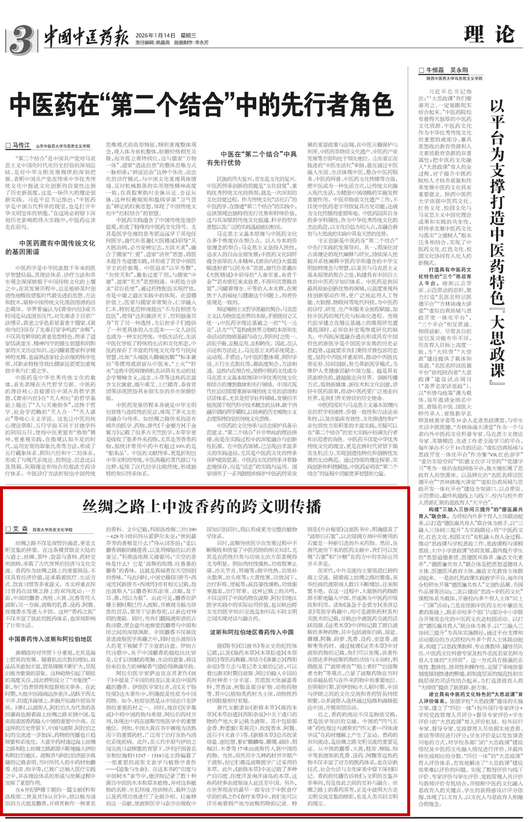 2026年1月14日,西南大学历史文化学院艾森(Ehsan Doostmohammadi)副教授所写的文章《丝绸之路上中波香药的跨文明传播》在中国国家中医药管理局主办的《中国中医药报》刊发。