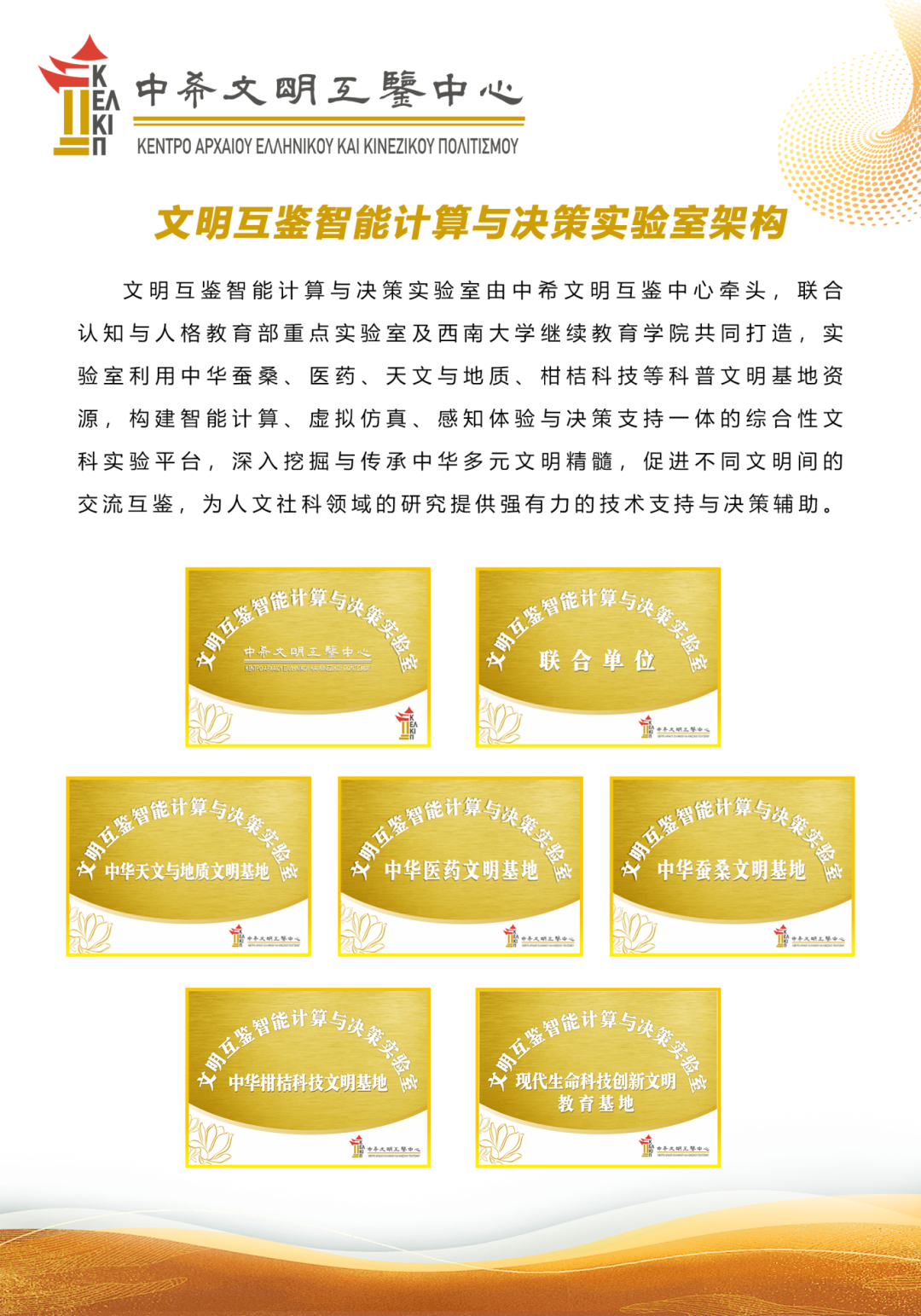 实验室瞄准人工智能、大数据挖掘和虚拟仿真等新技术,以认知与人格教育部重点实验室与东南亚减贫基地作为联合共建单位,以蚕桑、医药、天文地质、柑桔科技和现代生命科技五个领域相关重点平台为文明互鉴科普基地;依托哲学、历史学、计算机科学与技术、教育学、心理学、生物学和地理学等多学科交叉平台,以解决全球文明互鉴中的复杂问题为目标,围绕智能计算、治理决策、历史与哲学等相关数据挖掘和数字人文表达展开社会科学的计算与决策研究,主要覆盖智能计算、虚拟仿真和场馆体验三大领域,建设五个子实验室,分别是:中希文明智慧数据实验室、中希图像计算实验室、中希文明数智化教育产品开发室、古典文本数智化实验室、逻辑推理与智能决策实验室。具体介绍如图所示。