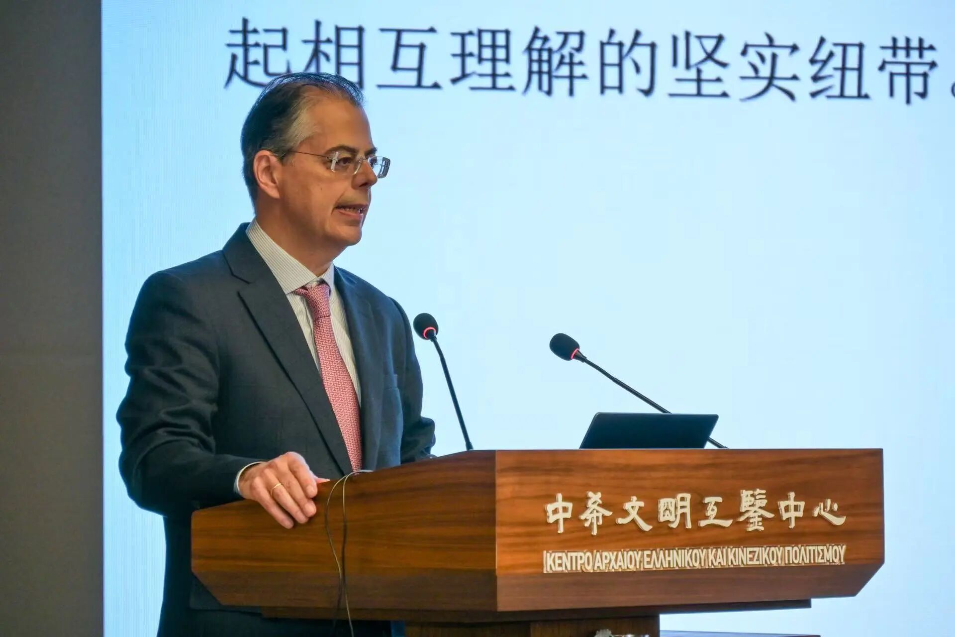 希腊驻华大使埃夫耶尼奥斯・卡尔佩里斯博士在开幕致辞中,强调了卡赞扎基斯在文明互鉴领域的卓越贡献,“卡赞扎基斯不仅是希腊语言的忠实传承者,更是希腊文明的核心传播者。”