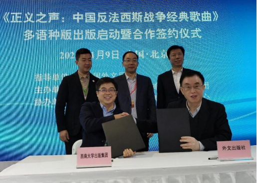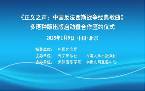 1月9日,《正义之声:中国反法西斯战争经典歌曲》多语种版出版启动暨合作签约仪式”在京举行。本次活动由中国外文局指导,外文出版社与西南大学出版集团联合主办。著名音乐学者向延生、石一冰主编的《正义之声》,精选了1931至1946年间产生的42首经典抗战歌曲,通过“乐谱—史料—音频”的多维模式,全景再现抗战历史。该书将推出中文版及中英、中法、中西、中俄、中阿对照等多个语种版本,是中希文明互鉴中心《文明互鉴书库》的重要组成部分。中国外文局副局长于运全、西南大学出版集团董事长张发钧等嘉宾出席了活动。此次出版旨在弘扬抗战精神,促进国际社会对中国抗战历史的认知与理解。